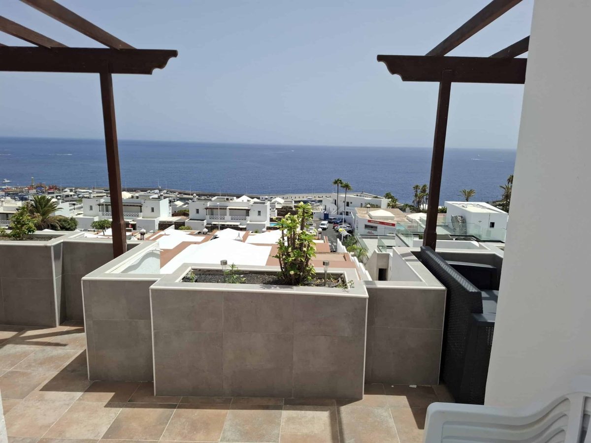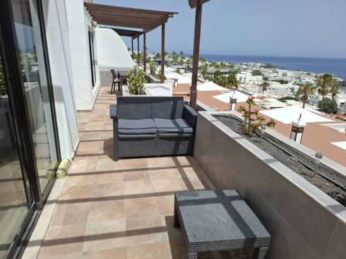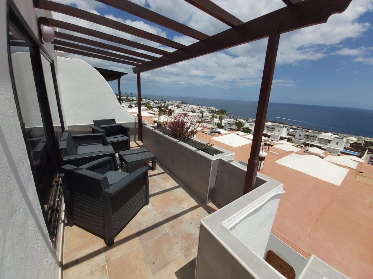 Extensive terrace with multiple seating areas and sun loungers