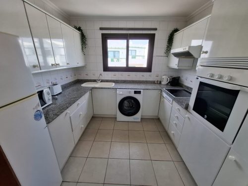 Fully fitted kitchen with washing machine, oven, halogen hob, microwave, kettle and toaster
